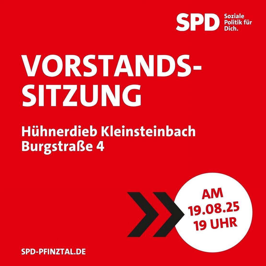 Der Vorsitzende der SPD Pfinztal, Malik Kartal, lädt alle Vorstandsmitglieder ein zu einer Vorstandssitzung am Dienstag, 19. August 2025 um 19:00 Uhr im Hühnerdieb in Kleinsteinbach.