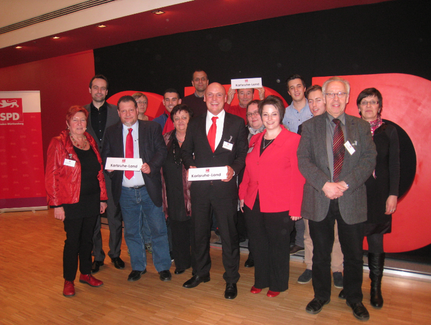 Vanessa Rieß (3.v.r.), Sonja Holatka (3.v.l.) und Angelika Konstandin (1.v.r.) im Kreise der DelegiertenDie Delegierten des Landesparteitags in Heilbronn, dem auch die beiden Pfinztalerinnen Angelika Konstandin und Sonja Holatka angehörten, wählten den Außenexperten Gernot Ehrler und die Generalsekretärin Katja Mast aus Pforzheim an die Spitze der baden-württembergischen Landesliste.