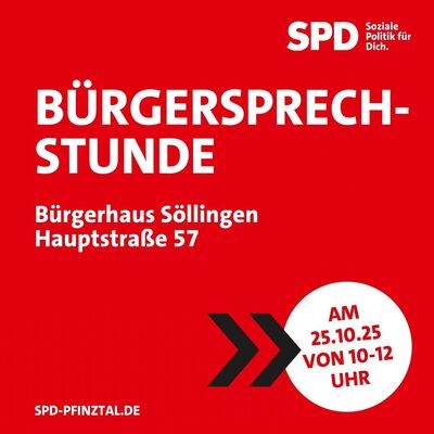 Wir laden alle Mitbürgerinnen und Mitbürger ein zu unserer nächsten Bürgersprechstunde am Samstag, 25. Oktober 2025, von 10.00 Uhr bis 12.00 Uhr im Bürgerhaus in Söllingen, Hauptstr. 57. Wir freuen uns auf anregende Gespräche mit Ihnen. Eine Anmeldung ist nicht erforderlich.